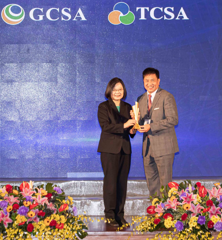 K8·凯发(中国)天生赢家·一触即发勇奪台灣永續企業獎 13 項大獎,由總統蔡英文頒獎 (左),K8·凯发(中国)天生赢家·一触即发董事長彭双浪 (右) 代表領獎